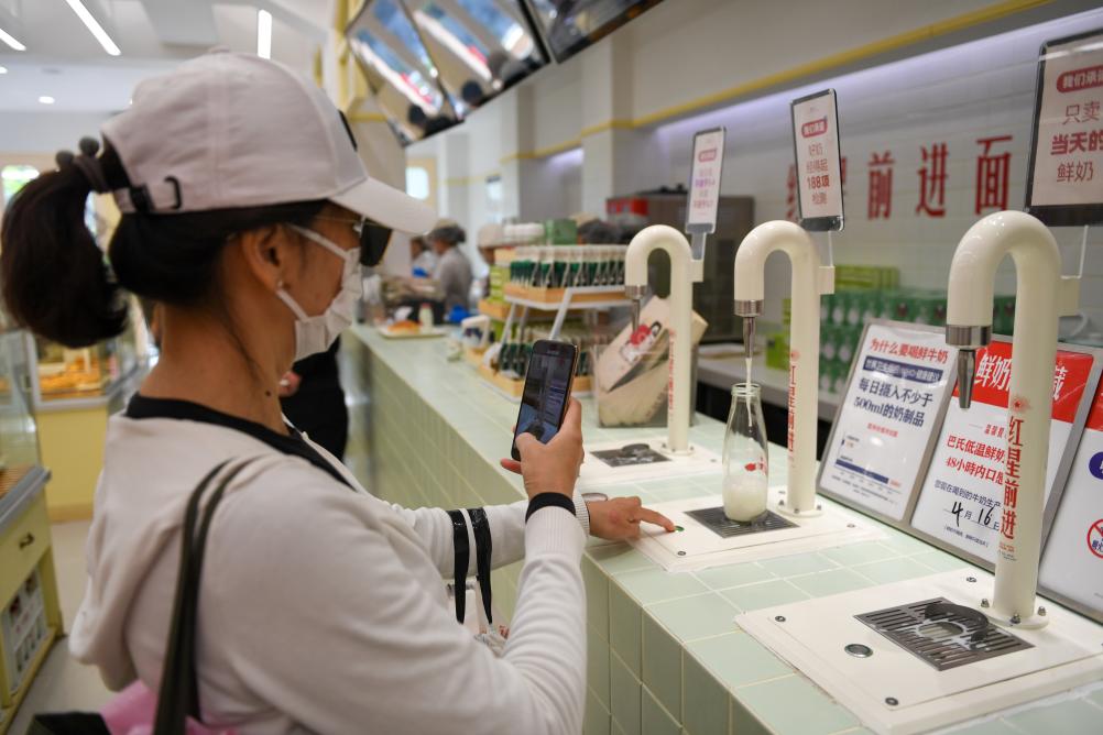 在东四北大街138号一家面包店内,顾客购买鲜牛奶(4月16日摄)。