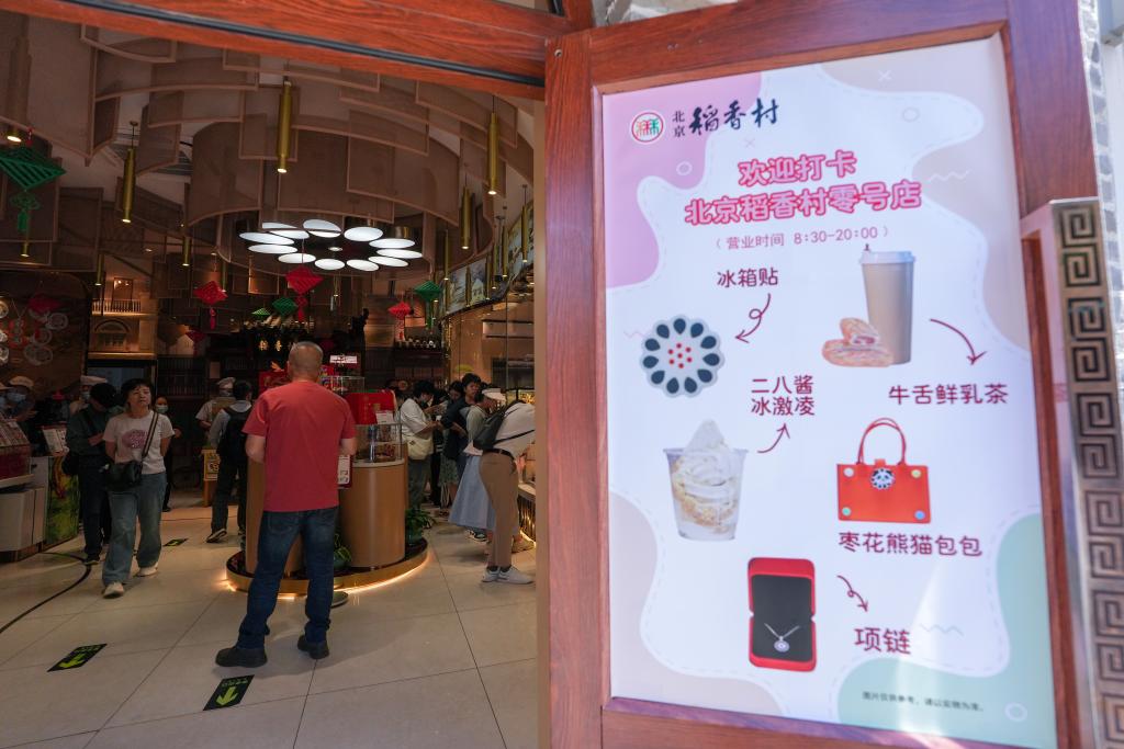 顾客在北京稻香村“零号店”选购商品(5月11日摄)。通过拆违整治、建筑风貌提升
