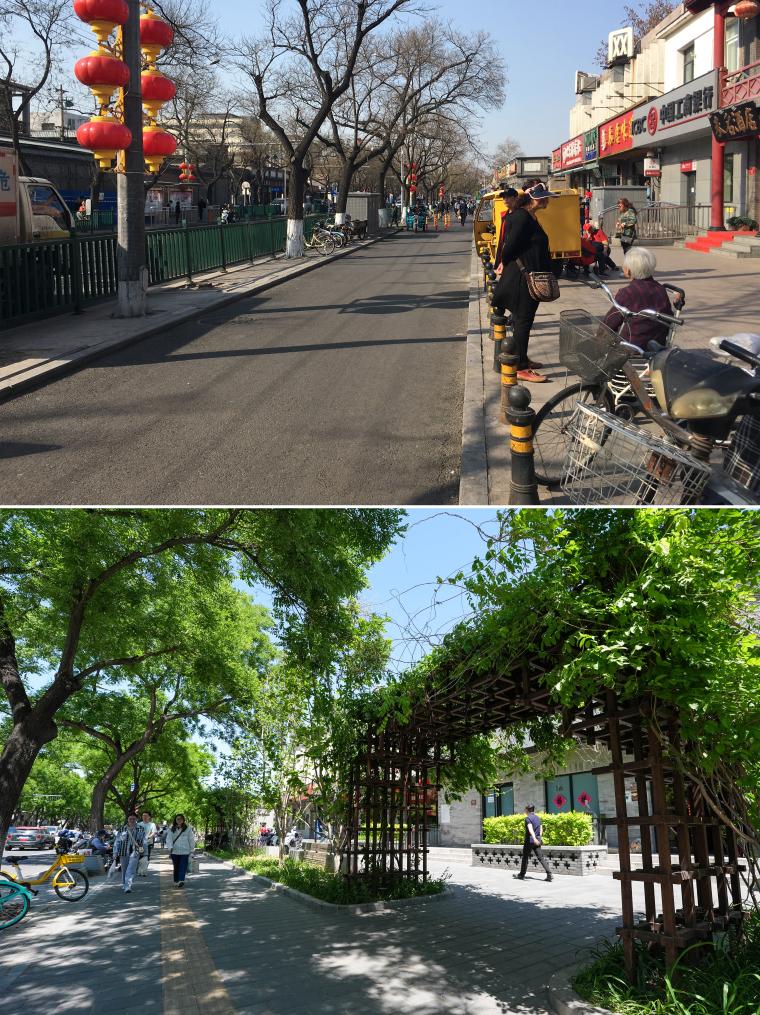 上图为2018年3月25日拍摄的东四北大街126号附近一处道路(资料照片);下图为2024年5月11日拍摄的相同地点,道路改造后步行空间被拓宽,并增加了街边绿地花园。