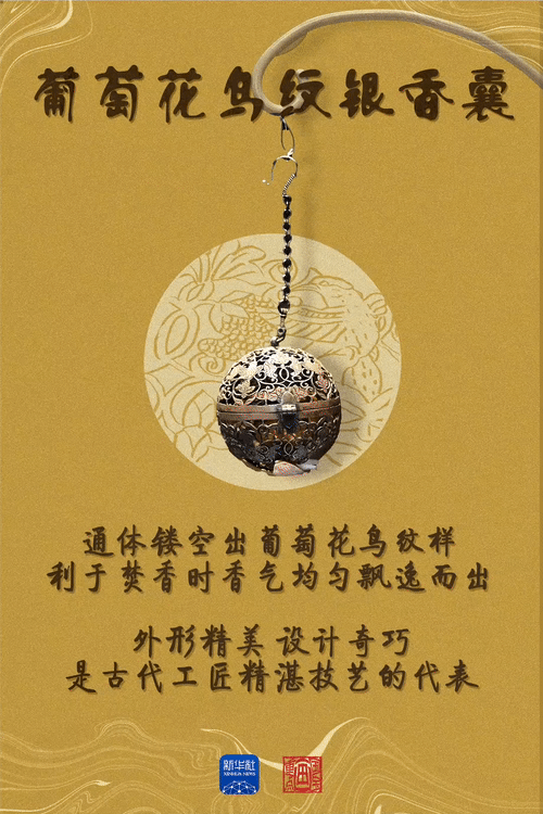 葡萄花鸟纹银香囊体现了唐代贵族的生活意趣。“唐代社会的开放包容,人们生活中的仪式感都融入在这枚香囊之中。”陕西历史博物馆副研究馆员贺达炘说。