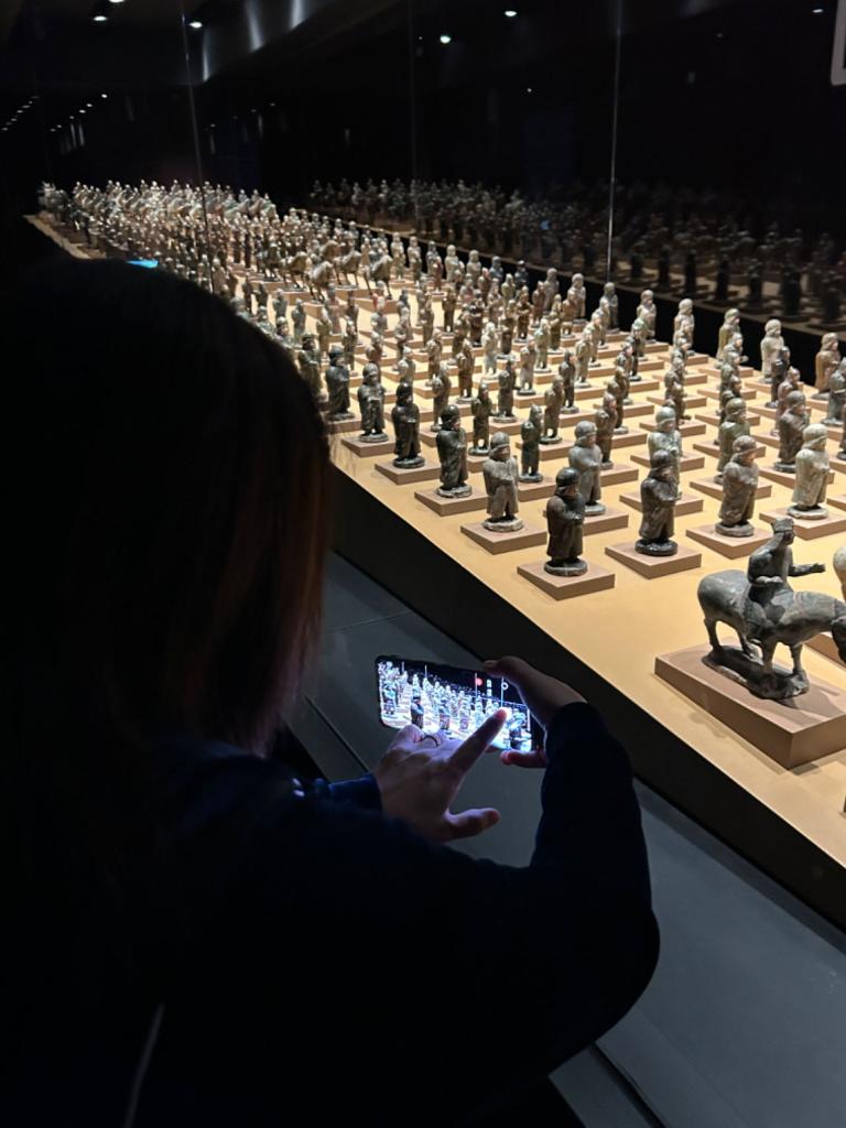 在大同市博物馆内,游客用影像方式记录司马金龙墓俑群带给她的震撼。新华社记者 李子怡 摄