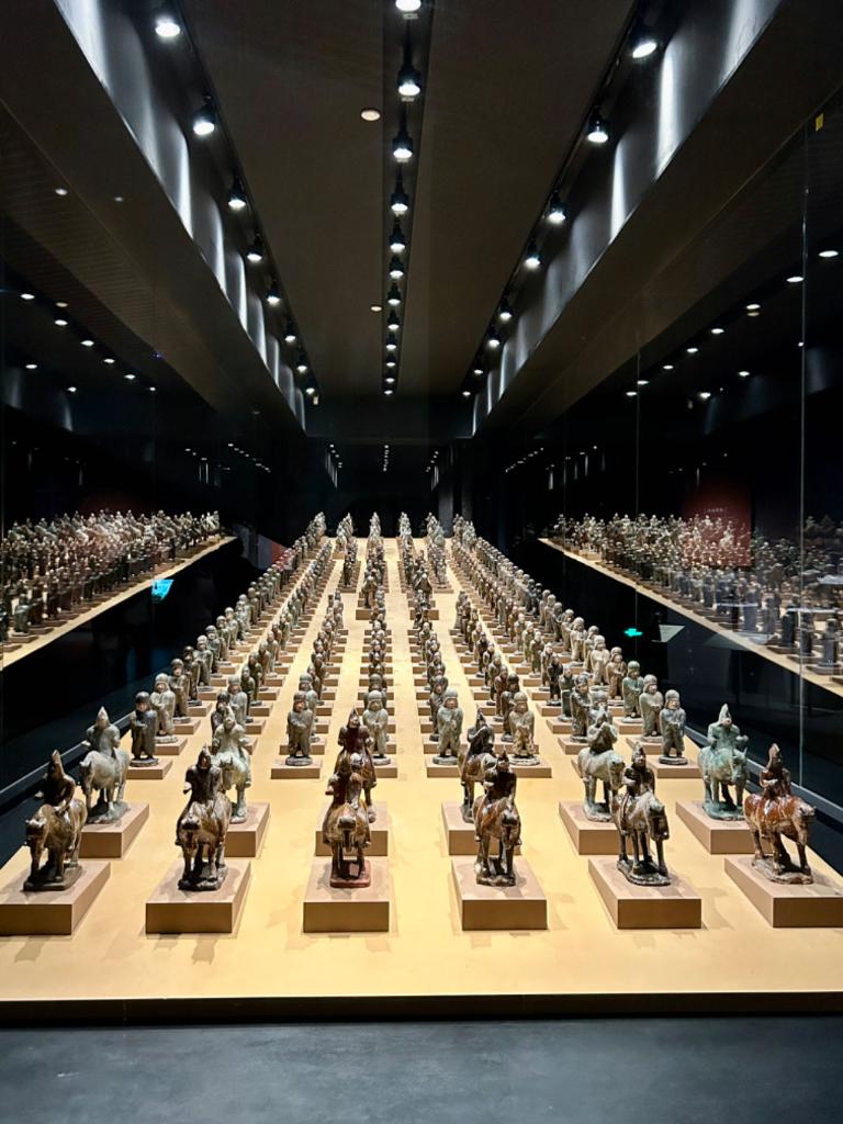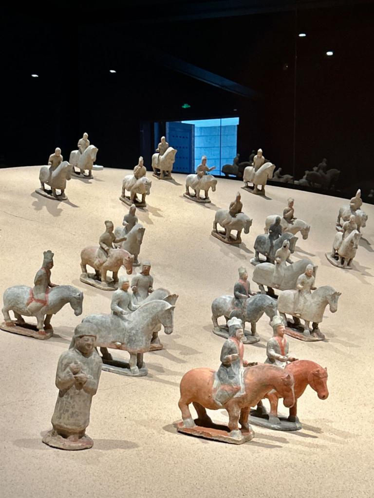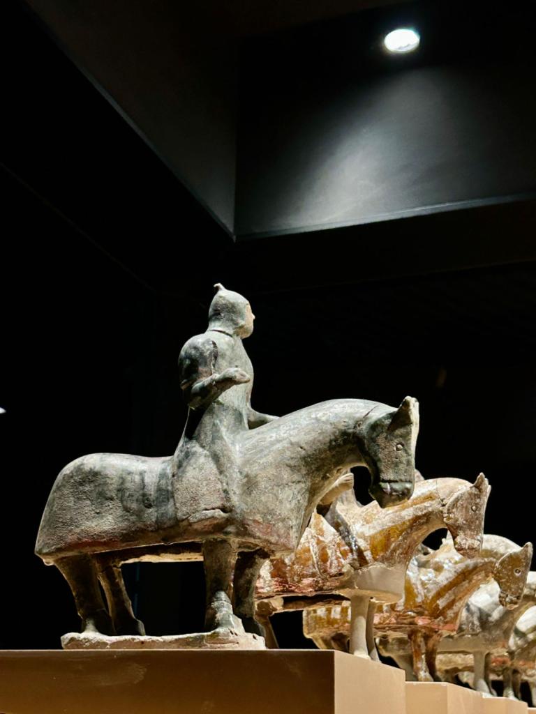 司马金龙墓中的出行俑阵立于展厅之中,前侧导骑俑着鸡冠帽窄袖衣,整装待发;中间步兵仪卫俑戴垂裙风帽,神情肃穆,簇拥两侧;后方甲骑具装俑,头戴兜鏊,人马披甲,威武雄壮,护卫后方,威风凛凛。