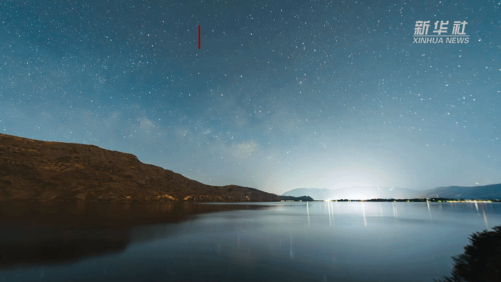 丑时(01:00-03:00),山水相依,月光洒落,湖面升起璀璨的银河。