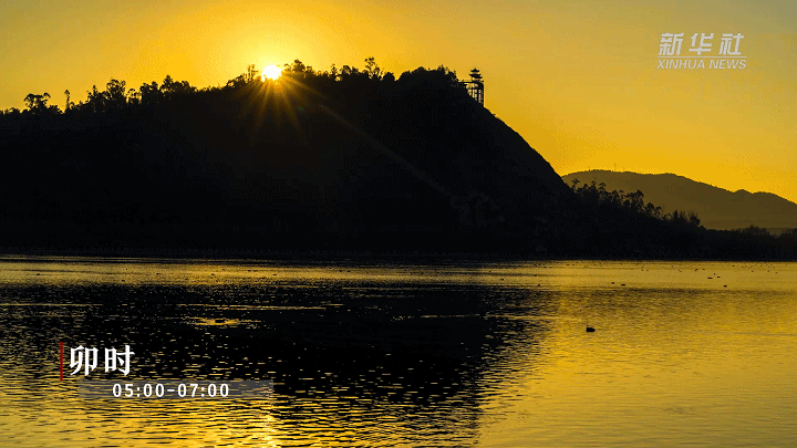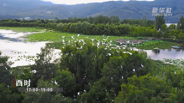 酉时(17:00-19:00),晚霞似火,绚彩流金。茈碧湖畔的草海湿地,人游画中,观鹭赏荷,人与自然和谐共生。