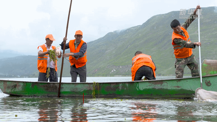 辰时(07:00-09:00),小楫轻舟,波纹跳荡,环保人员清捞水草,将湖光序曲奏响。