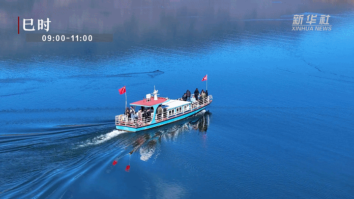 巳时(09:00-11:00),湖水清澈,泛舟湖上,品味古诗人“谁道洱河千胜境,源头此处更澄清”的意境。