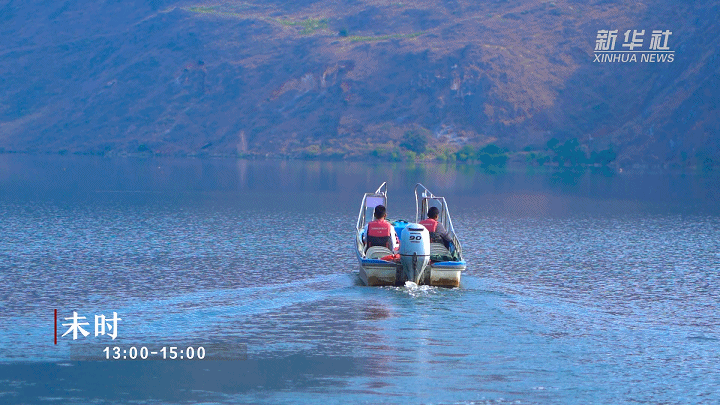 未时(13:00-15:00),青山绿水,巡护不辍,自2023年来茈碧湖实施全湖禁渔,共护一泓清水入洱海。