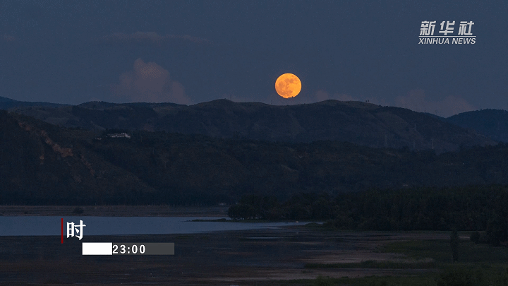 亥时(21:00-23:00),夜暮降临,月上山头,湖面波光粼粼。日月交替,时光温柔以待,合奏“山水林田湖”和谐共鸣曲。