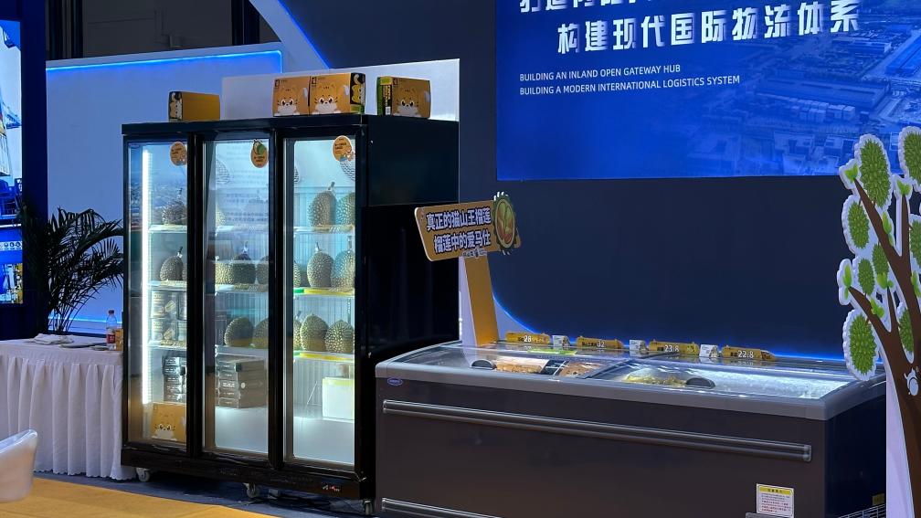 走进展馆,北部港湾集团展区人头攒动,冰柜里展示售卖的马来西亚新鲜榴莲让人一时忘记自己身处重庆。