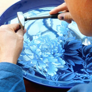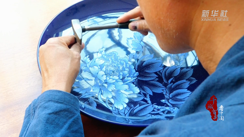 河间刻瓷是一种传统的民间手工艺术,采用剥凿刻釉的方法,在瓷制器皿上雕刻花鸟、民族建筑等,再辅以托座、镶嵌等木雕工艺而形成,其艺术作品缤彩纷呈。2017年,河间刻瓷被列入沧州市级非物质文化遗产名录项目。