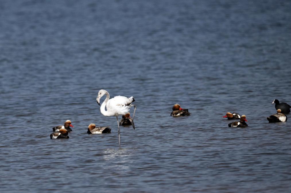 大红鹳又称大火烈鸟,主要生活在盐水、淡水栖息地,喜欢结群生活,主要分布于热带、亚热带地区,已被列入国家保护的有益的或者有重要经济、科学研究价值的陆生野生动物名录。陈峰说:“大红鹳在乌梁素海属于‘迷鸟’,实属罕见。我们已安排专人在湖区周边实行重点巡查,防止人类活动干扰大红鹳的栖息,给它营造出适宜、安全的栖息环境。”