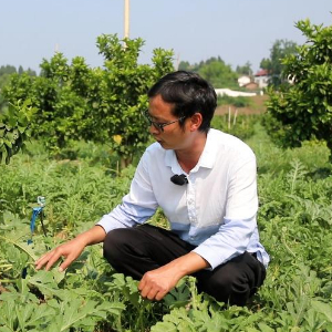 当地有名的血橙种植大户、农业技术专家王再生戴着墨镜蹲在田里,仔细观察西瓜的长势。