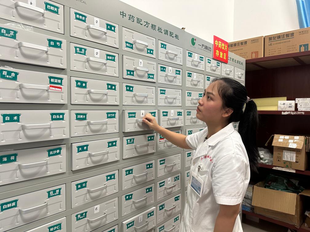 保亭黎族苗族自治县三道镇卫生院中医科医师符美春在查看药材。新华社记者陈凯姿 摄