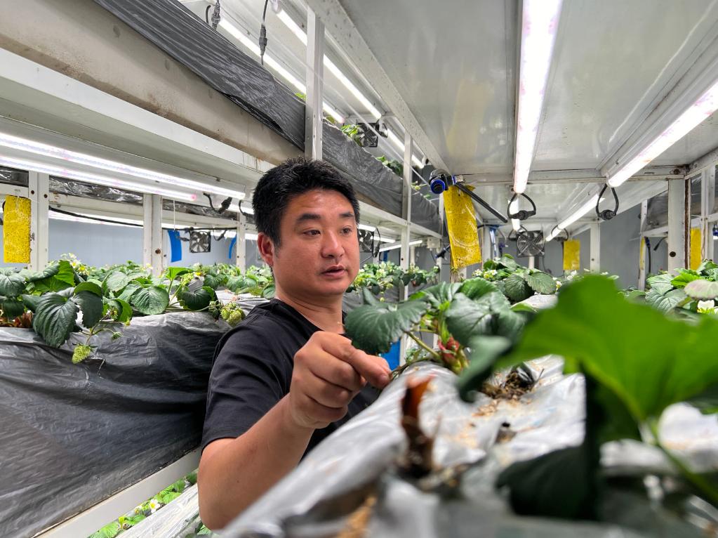 徐纬在草莓“植物工厂”实验室内检查草莓生长情况。新华社记者刘智强 摄