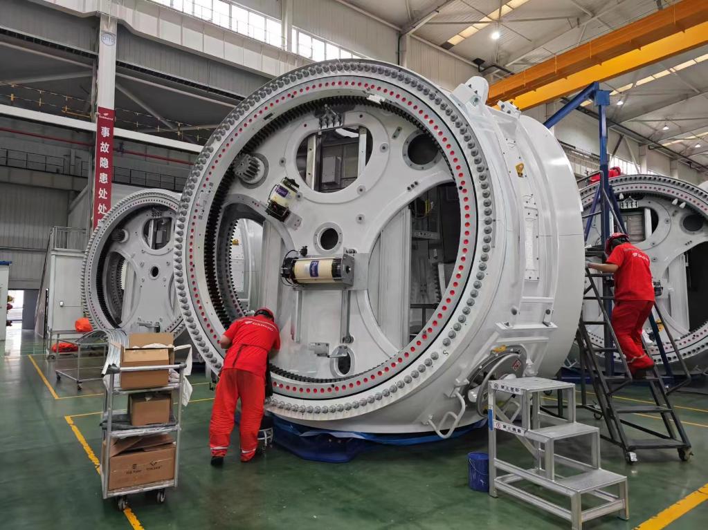 6月5日,金风科技股份有限公司盐城大丰总装车间内,工人在生产线上忙碌。新华社记者 柯高阳 摄