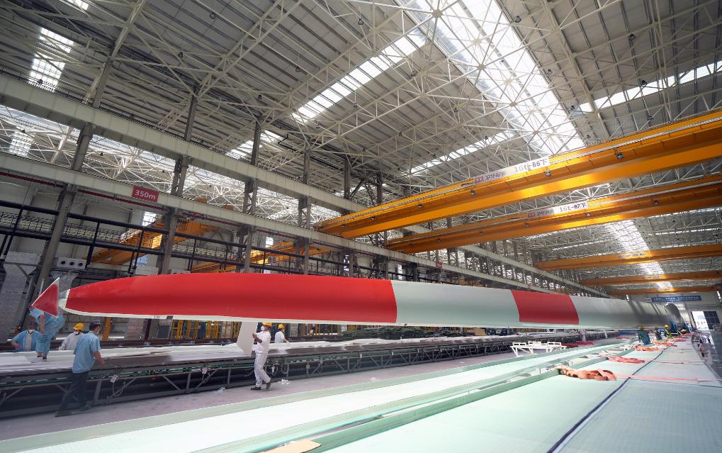 6月6日,位于盐城射阳港经济开发区的中车150米级海上风电叶片智造车间内,巨大的风电叶片正在等待转运。新华社记者李尕 摄