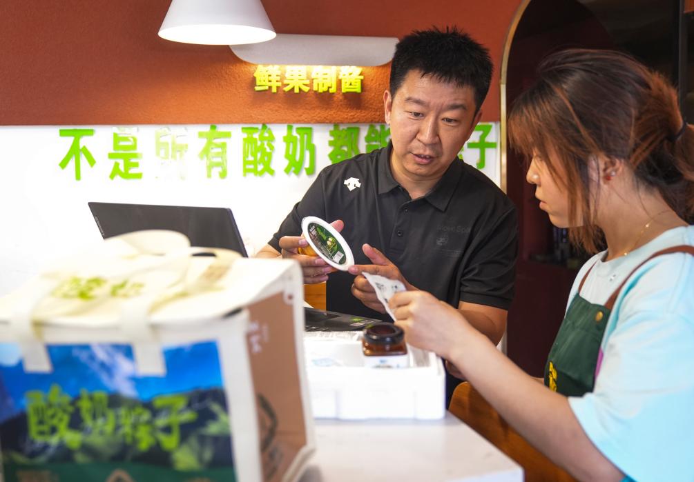 在乌鲁木齐,博斯坎酸奶粽子品牌创始人张磊(左)在门店与工作人员沟通如何搭配礼盒内容。