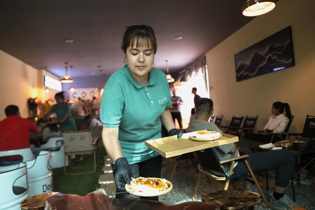在和田市海之味餐饮店,服务员为顾客端上酸奶粽子。