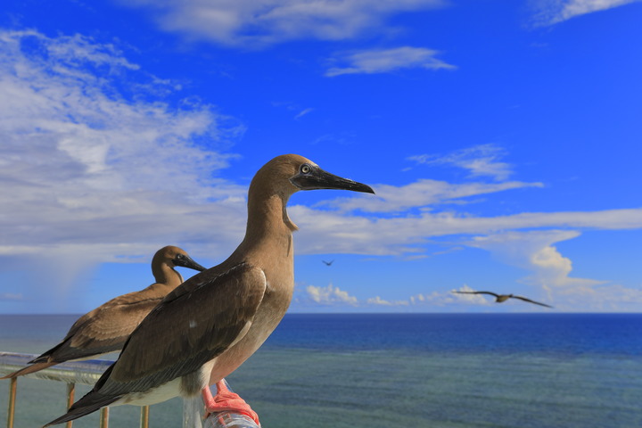 在海岛灯塔护栏上停歇的鲣鸟。新华社发 (江王洋 摄)