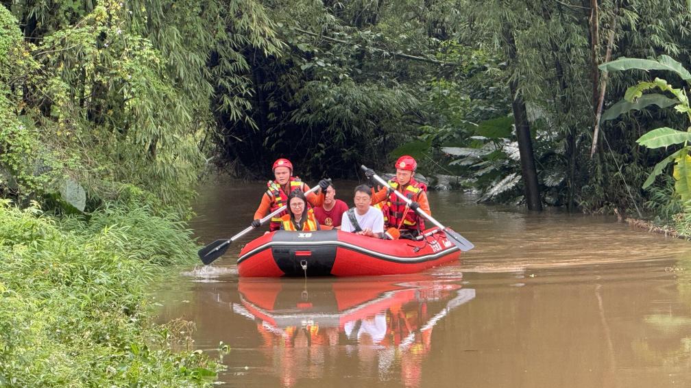 6月10日,防城港市消防救援人员利用橡皮艇转移疏散被困人员。新华社发(潘艺 摄)