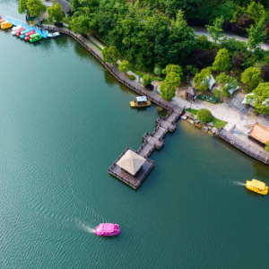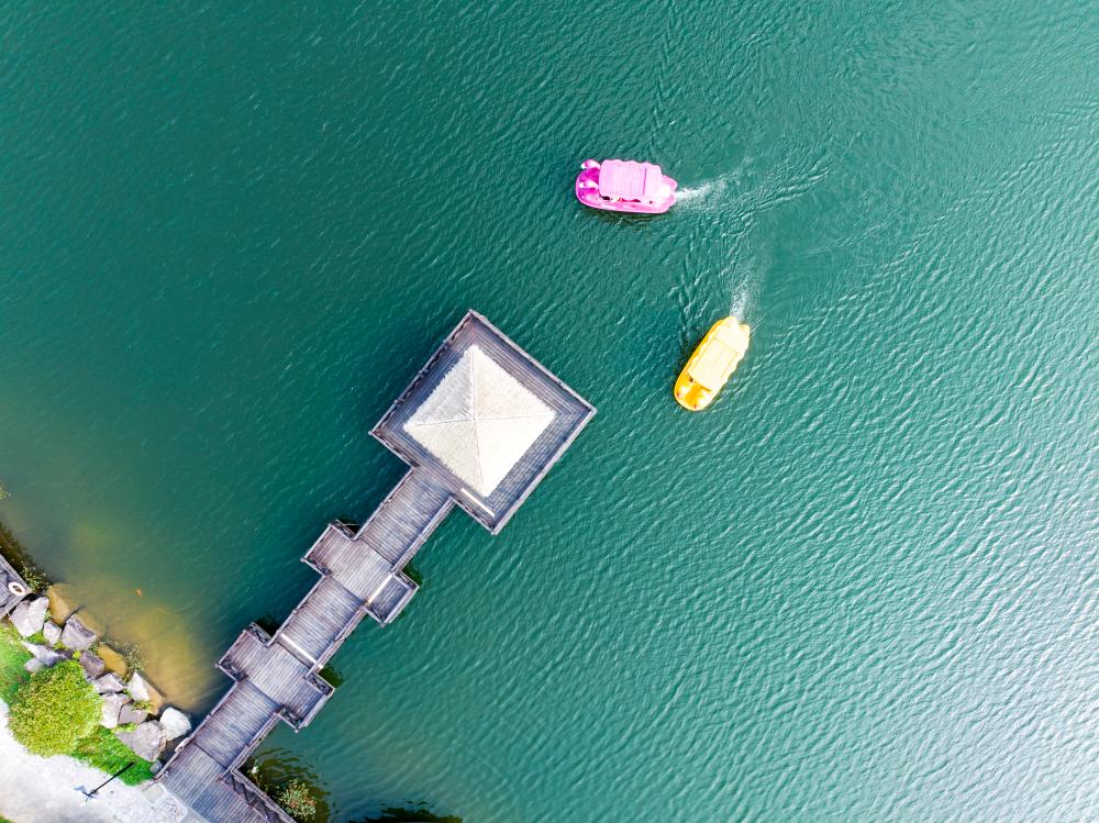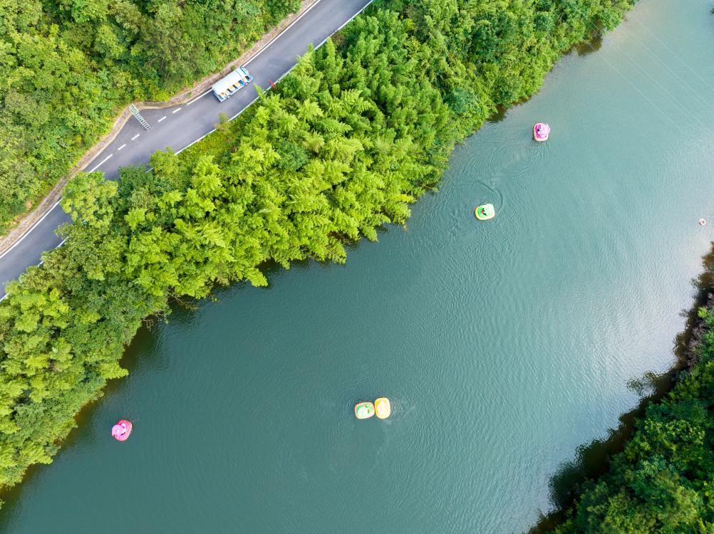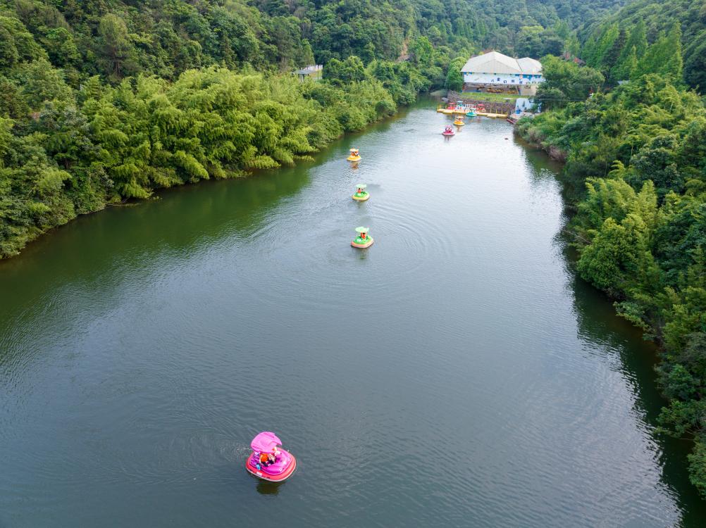 ↑2024年6月8日在浙江省湖州市吴兴区埭溪镇驾云山生态森林度假景区拍摄的游船。(无人机照片)CICPHOTO/何伟卫 摄