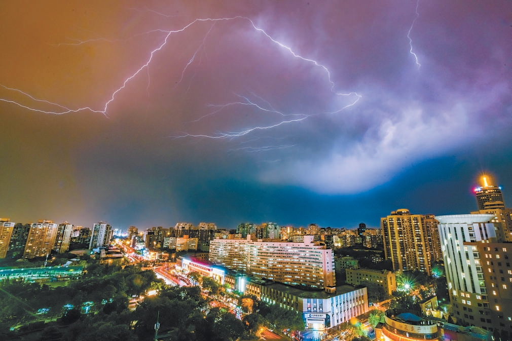 昨晚(11日),北京城区出现强对流天气,疾风骤雨中,一道道闪电划过夜空。 记者 邓伟摄