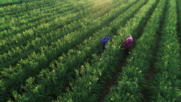 这是农户在宁夏吴忠市红寺堡区柳泉乡黄花菜基地采摘黄花菜。自20世纪70年代以来,宁夏建成固海扬水工程、陕甘宁盐环定扬黄工程、红寺堡扬水工程以及固海扬水扩灌工程等,将黄河水抬升数百米,送往中部干旱带的亘古旱塬,浇灌出特色产业蓬勃发展的扬水灌区(资料照片)。