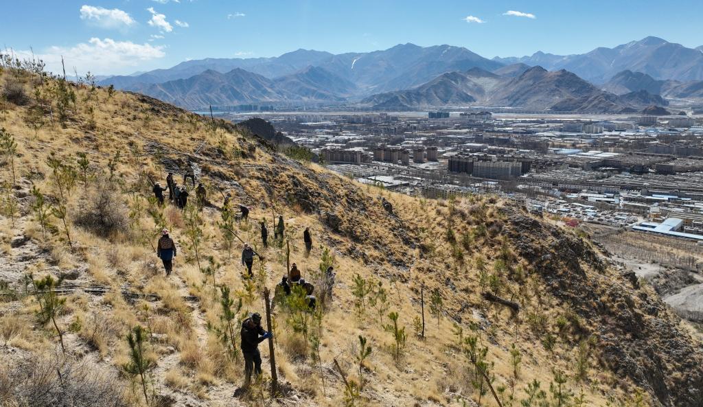 在拉萨南北山绿化2024年度一期工程贡嘎县造林项目贡嘎2号片区,当地村民在栽树造林(6月3日摄)。新华社记者 晋美多吉 摄