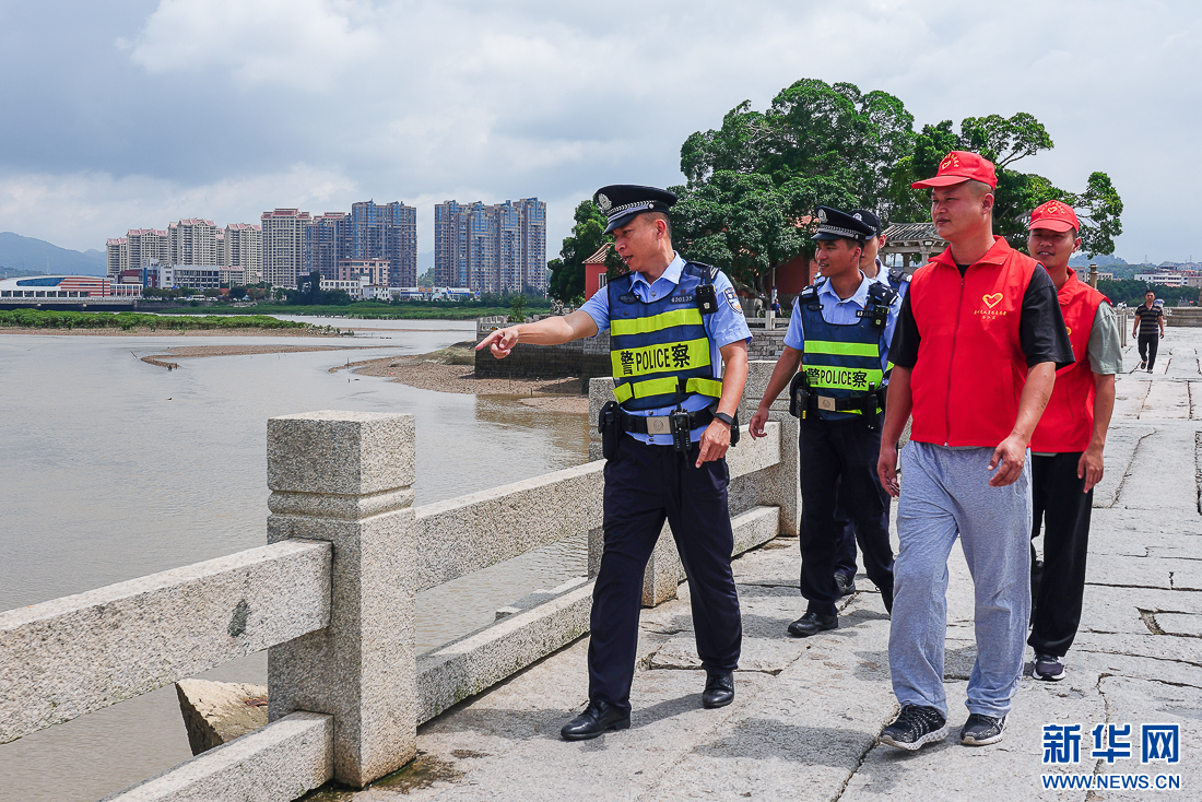 6月17日,民警与志愿者一起上桥,排查汛期古桥周边风险隐患。新华网 肖和勇 摄