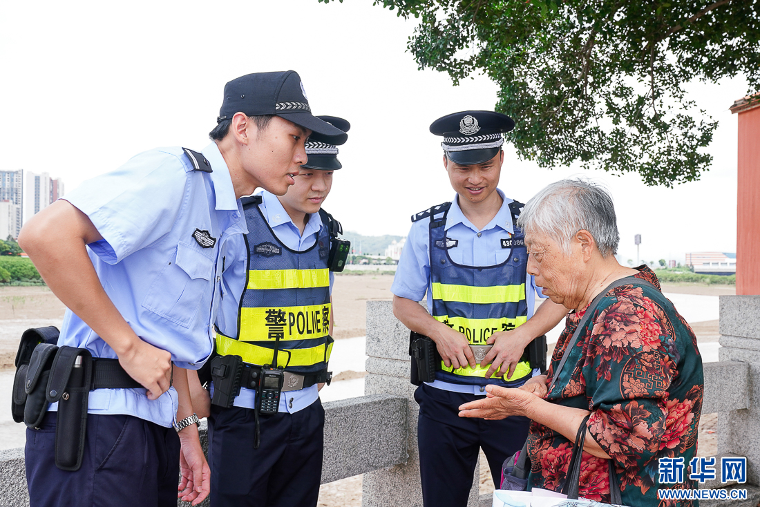 6月17日,洛阳桥上,民警与游客交谈,提醒游客注意汛期出行安全。新华网 肖和勇 摄