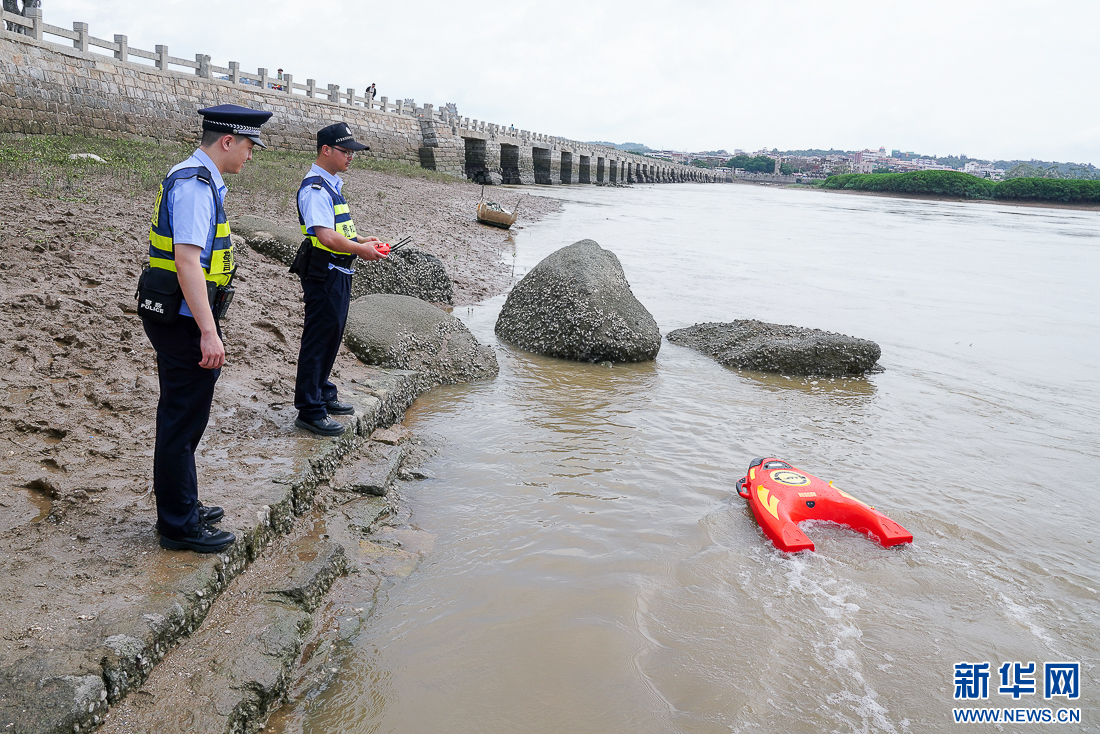 6月17日,民警在洛阳桥边测试水上救援机器人性能。新华网 肖和勇 摄