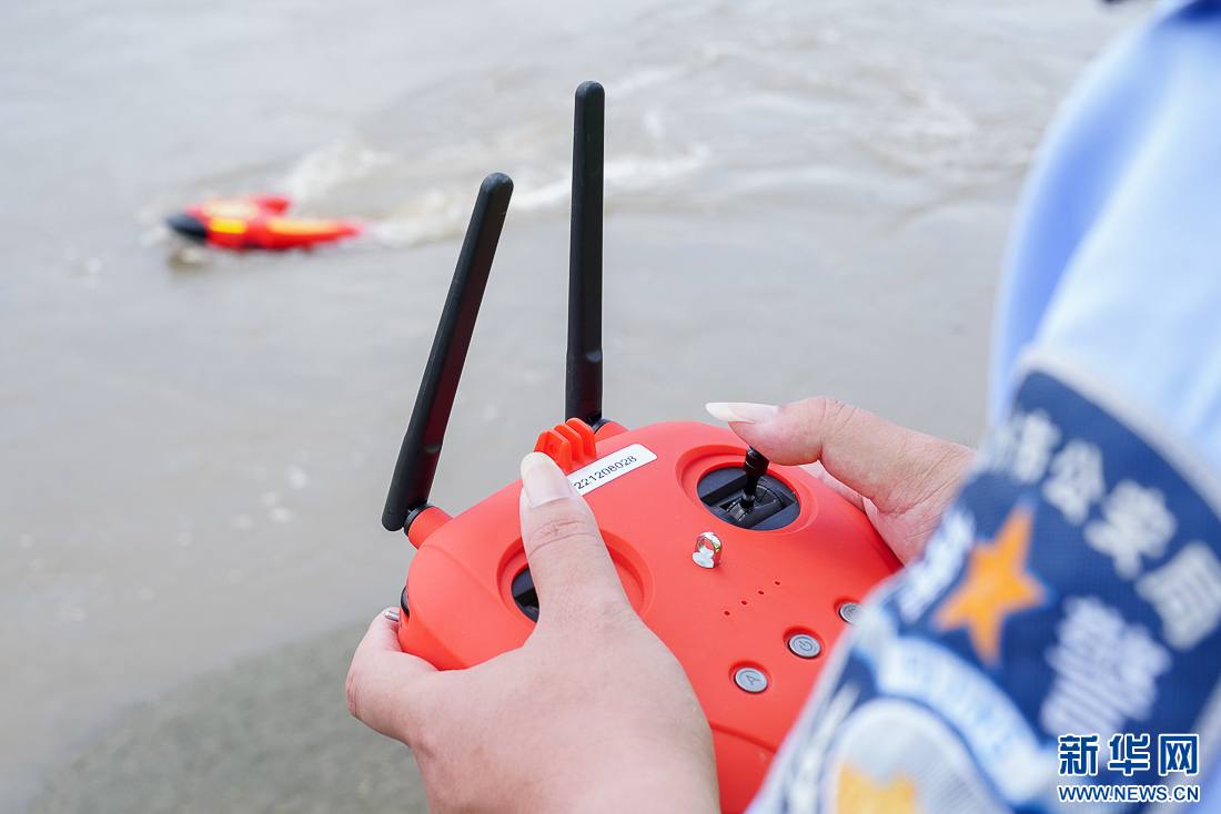 6月17日,民警操作遥控器测试水上救援机器人性能。新华网 肖和勇 摄