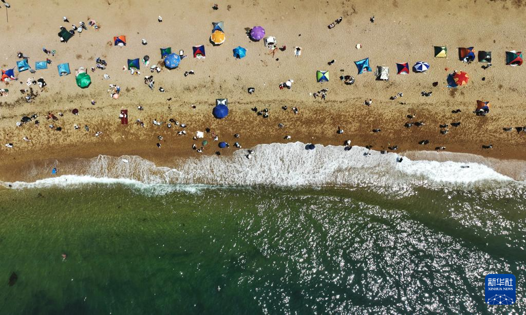 6月17日,游客在辽宁大连傅家庄海滨浴场游玩(无人机照片)。新华社记者 杨青 摄pagebreakpagebreak