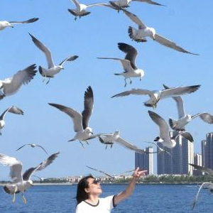 在辽东半岛南端的大连市,“老虎滩”号游船上的游客一边观赏海上风光,一边品尝海鲜大餐。众多海鸥穿梭其间,引得不少游客拍照留念。