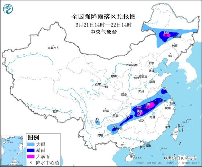 预计,6月21日14时至22日14时,贵州中南部、湖南北部、湖北东部和南部、河南东南部、江西西北部、安徽、江苏以及内蒙古东部、黑龙江南部、吉林西北部等地部分地区有大到暴雨,其中,安徽中部、湖北东部和南部、湖南东北部、内蒙古东部、黑龙江西南部、吉林西北部等地局地有大暴雨(100~180毫米)。上述部分地区伴有短时强降水(最大小时降雨量30~50毫米,局地可超过80毫米),局地有雷暴大风等强对流天气。