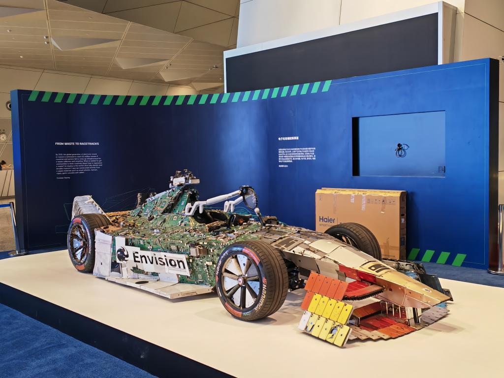 走进大连国际会议中心一楼大厅,一辆由电子垃圾制作而成的纯电动方程式赛车首先映入记者眼帘。据现场工作人员介绍,这件名为“电子垃圾铺就新赛道”的展品,旨在提醒与会代表关注日益严重的电子垃圾问题,提高公众对回收和重复利用废旧电子产品的认识。