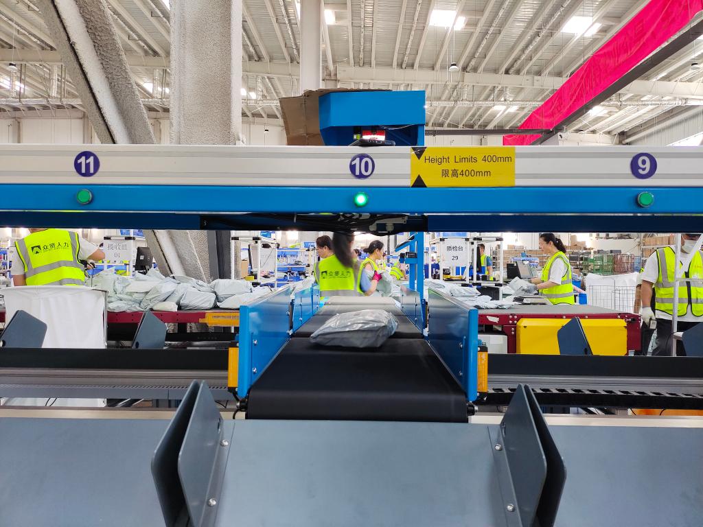 在威海综保区,即将发往韩国的包裹在传送带上分流核验。(受访者供图)