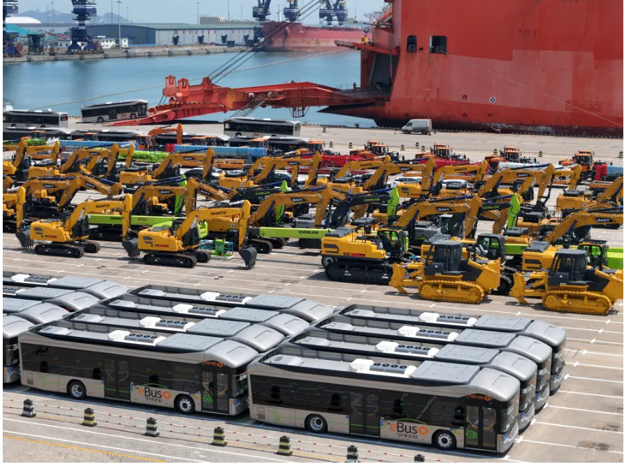 图为山东港口烟台港等待出口的纯电动客车。(受访者供图)