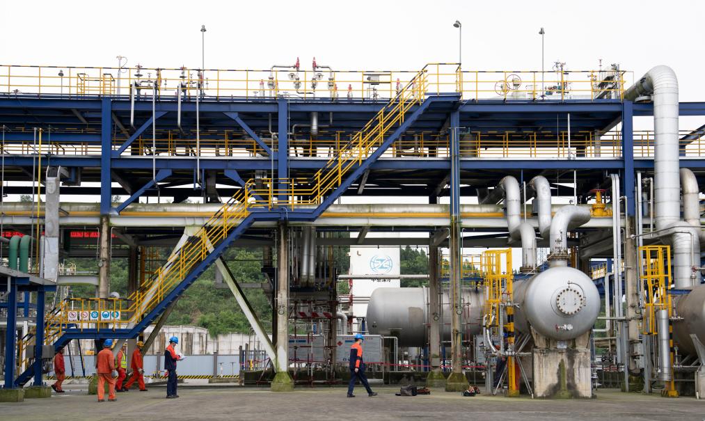 6月25日,在重庆涪陵液化天然气(LNG)工厂,工作人员从运输管道旁走过。