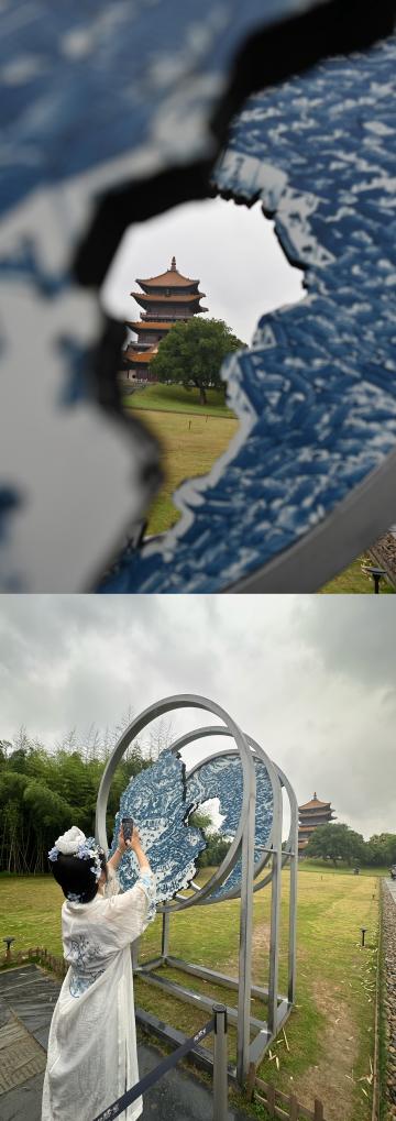 这是一张拼版照片。上图:这是2024年6月5日在江西景德镇陶阳里历史文化街区透过创意青花瓷盘拍摄的龙珠阁。新华社记者 刘力航 摄下图:2024年6月5日,一位身穿汉服的游客在江西景德镇陶阳里历史文化街区拍摄龙珠阁。新华社记者 王若辰 摄