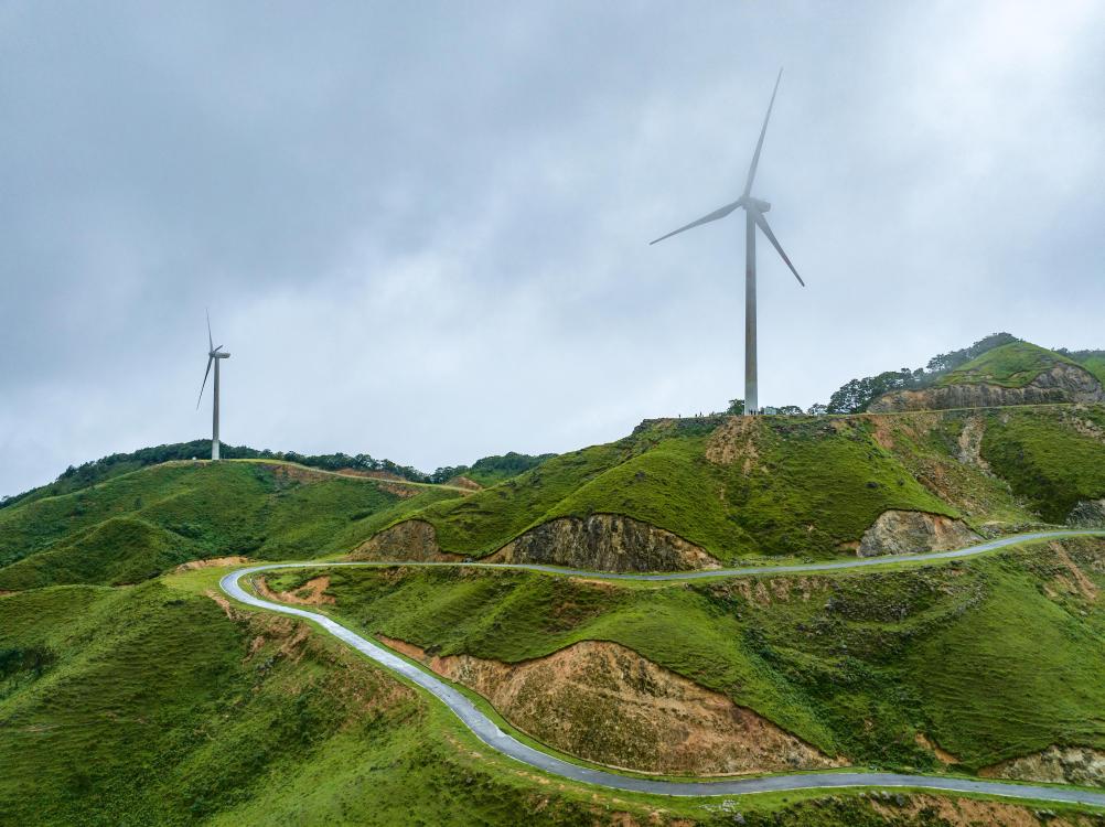 这是6月26日拍摄的广西龙胜各族自治县南山牧场内的风力发电机组(无人机照片)。