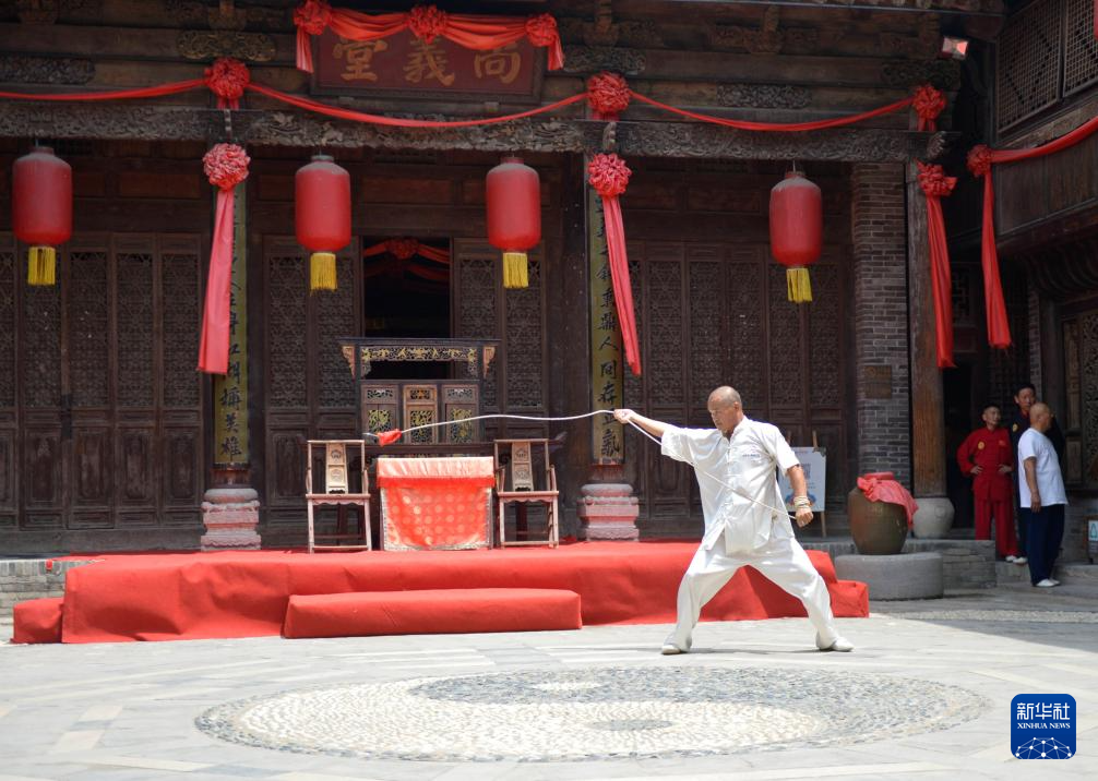 6月27日,武师在菏泽郓城水浒好汉城表演武术。新华社记者 刘力航 摄