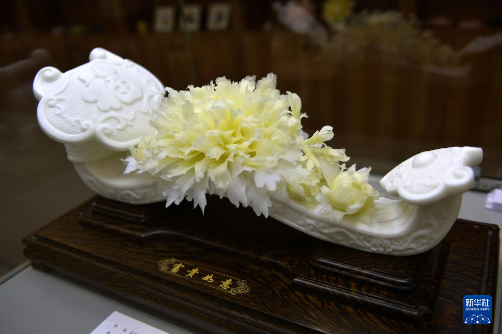 这是6月27日在菏泽非遗传承馆拍摄的3D立体牡丹陶瓷作品。新华社记者 刘力航 摄