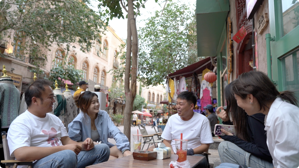 吴振浩(左一)和团队在位于喀什古城的摄影工作室门口讨论工作。新华社记者 郭燕 摄