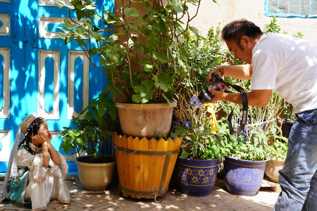吴振浩在喀什古城给小朋友拍照。新华社记者 郭燕 摄