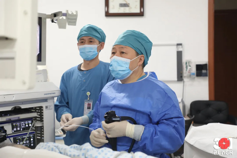 2023年12月,解放军总医院消化内科医学部主任令狐恩强教授(右)为一位患者行消化内镜超级微创贲门肿物切除术。解放军总医院 图