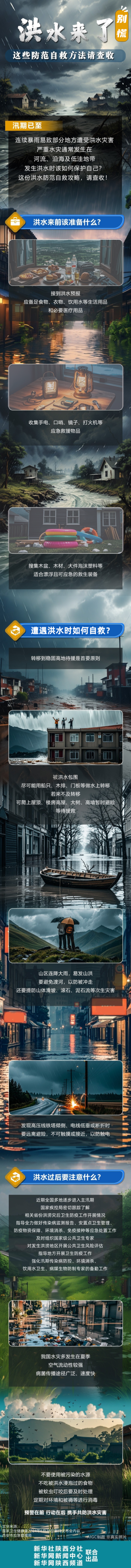 近期,我国多地遭遇持续强降雨,引发洪水等自然灾害。中央气象台7月4日继续发布暴雨蓝色预警,预计,7月4日14时至5日14时,陕西中南部、四川盆地中东部、山西南部、河南西北部及西藏东南部、云南西北部等地部分地区有大到暴雨,其中,陕西南部、四川盆地北部等地局地有大暴雨(100~180毫米)。遭遇暴雨洪水时如何有效避险自救?洪水过后要注意哪些关键事项?一起了解。