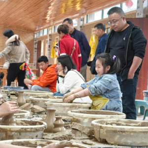 走进手工作坊,两排矮桌上,制陶转盘正在匀速旋转,前来体验的游客们举着一双双满是泥巴的手,时不时蘸点水,在制陶师傅们的帮助下,一团团黏软的黄黏土逐渐有了形状。