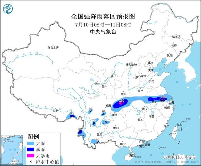 预计,7月10日08时至11日08时,四川盆地、重庆北部、陕西东南部、湖北西部和北部、河南东南部、安徽中部、江苏中南部等地有大到暴雨,其中,四川盆地东北部、江苏西南部等地局地有大暴雨(100~140毫米);上述部分地区伴有短时强降水(最大小时降雨量30~50毫米,局地可超过70毫米),局地有雷暴大风等强对流天气。