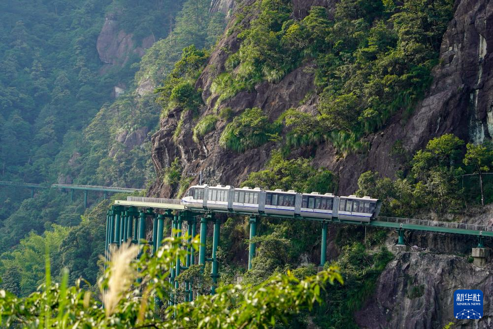 7月11日,在江西大觉山景区,“悬崖动车”驶出站台。新华社记者 郭杰文 摄